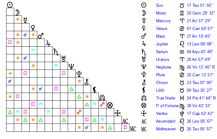 | Sun | 17 Taurus 52 | 18 Taurus 21 | 16 Leo 51 |