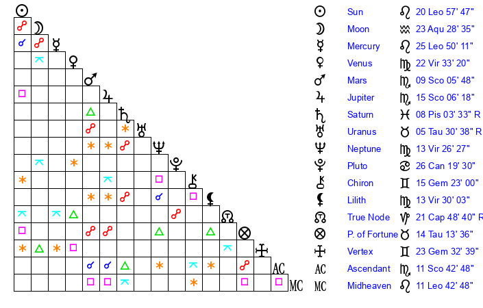 | Sun | 20 Leo 57 | 22 Leo 9 | 19 Scorpio 23 |