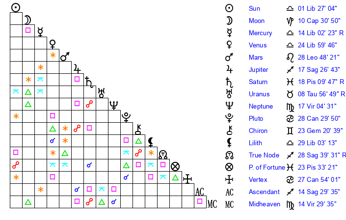 | Sun | 1 Libra 27 | 1 Libra 54 | 0 Capricorn 42 |