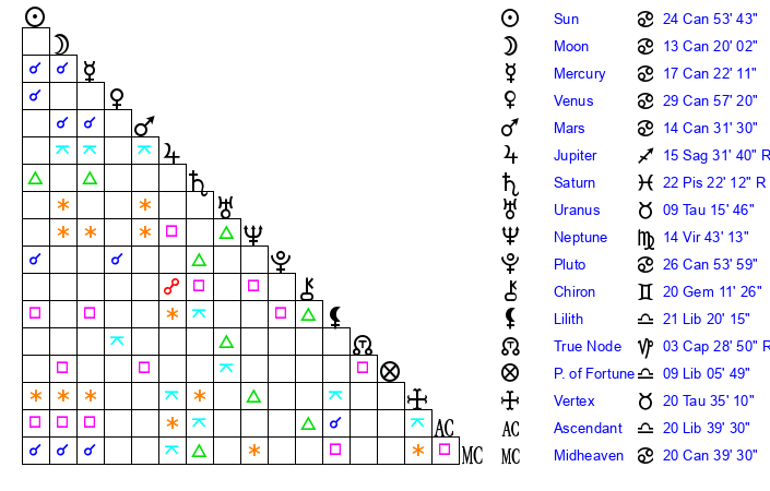 | Moon | 13 Cancer 11 | 21 Aries 6 | 13 Libra 15 |