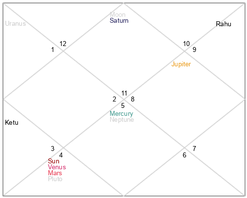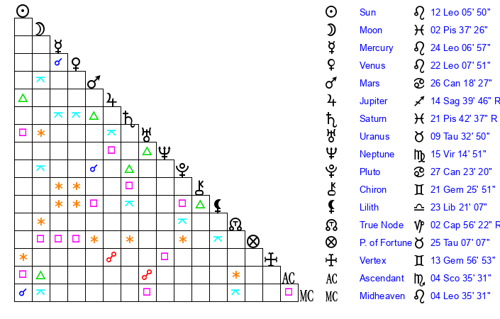 | Moon | 2 Pisces 35 | 17 Sagittarius 34 | 13 Gemini 32 |