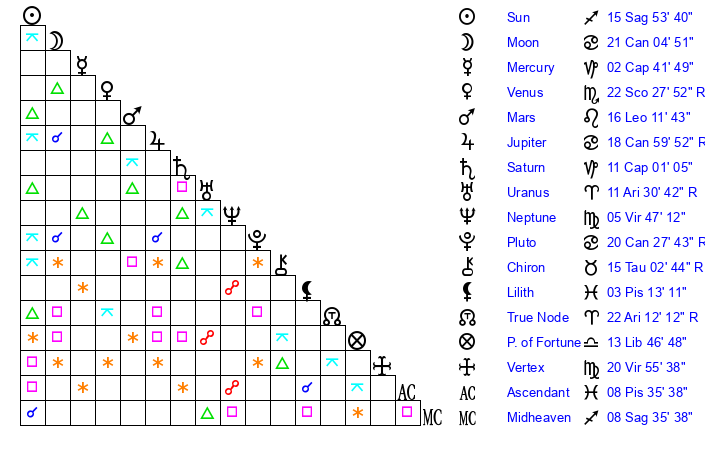 | Pluto | 20 Cancer 27 | 0 Aquarius 24 | 18 Cancer 46 |