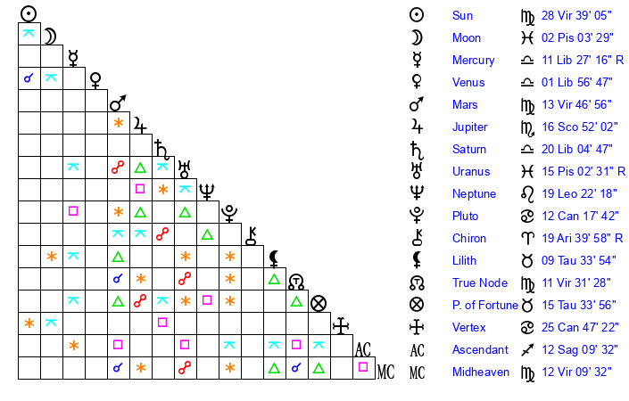 | Saturn | 20 Libra 39 | 28 Pisces 16 | 1 Scorpio 35 |