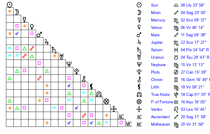 | Neptune | 15 Virgo 13 | 0 Aries 29 | 16 Virgo 43 |