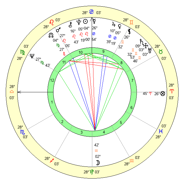 | Venus | 5 Cancer 20 | 26 Gemini 1 | 17 Libra 23 |