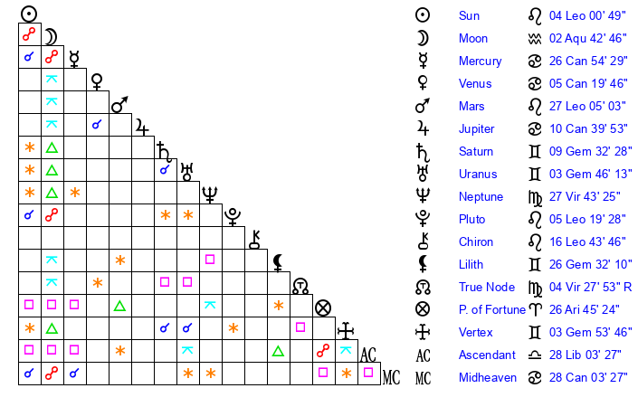 | Pluto | 5 Leo 20 | 2 Aquarius 31 | 7 Leo 10 |