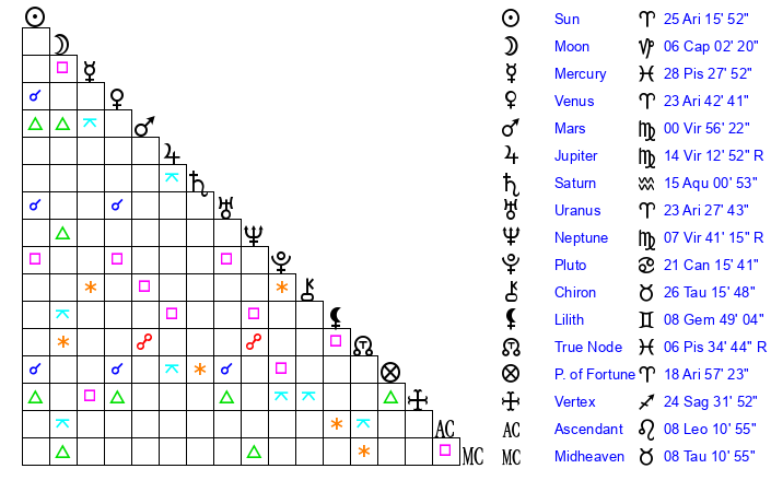 | Venus | 23 Aries 43 | 24 Pisces 47 | 16 Leo 39 |