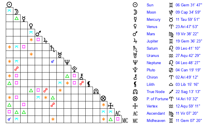 | Moon | 9 Capricorn 40 | 29 Gemini 42 | 8 Sagittarius 39 |