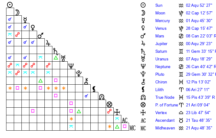 | Jupiter | 0 Aquarius 16 | 11 Gemini 30 | 20 Aquarius 49 |