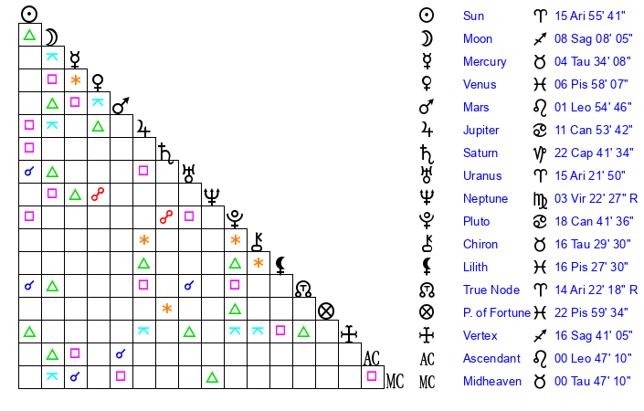 | Sun | 15 Aries 56 | 17 Aries 8 | 16 Cancer 30 |