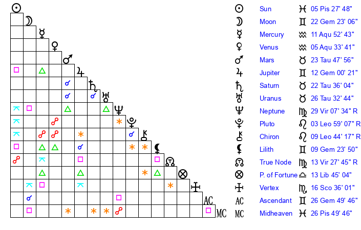 | Sun | 5 Pisces 28 | 6 Pisces 20 | 27 Taurus 6 |