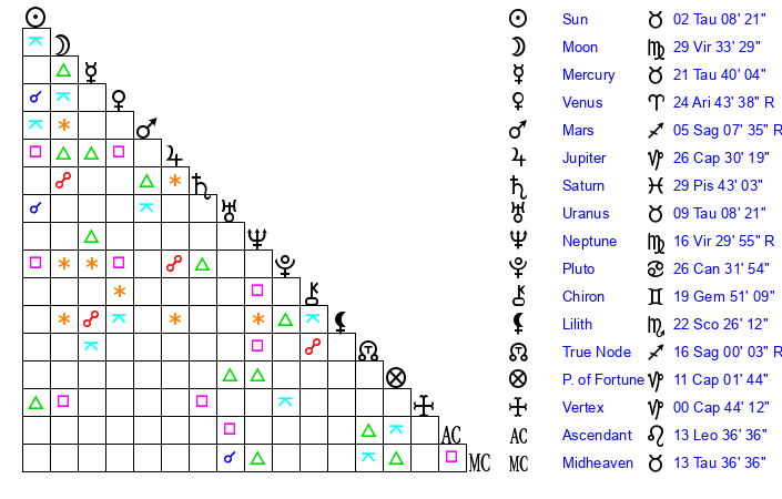 | Moon | 29 Virgo 28 | 22 Aquarius 59 | 13 Sagittarius 41 |