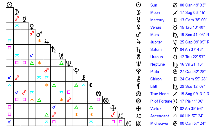 | Pluto | 27 Cancer 32 | 3 Aquarius 18 | 29 Cancer 44 |