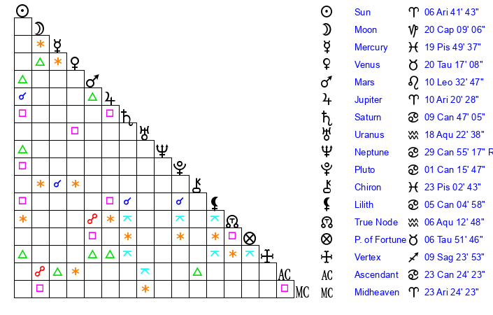 | Neptune | 29 Cancer 55 | 29 Pisces 53 | 2 Leo 0 |