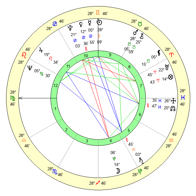| Sun | 28 Gemini 9 | 28 Gemini 40 | 27 Virgo 30 |