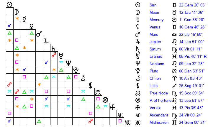 | Sun | 22 Gemini 20 | 22 Gemini 56 | 3 Libra 17 |