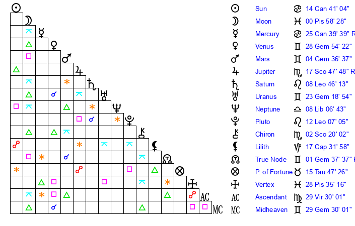 Pluto | 12 Leo 6 | 2 Aquarius 59 | 14 Leo 18 |