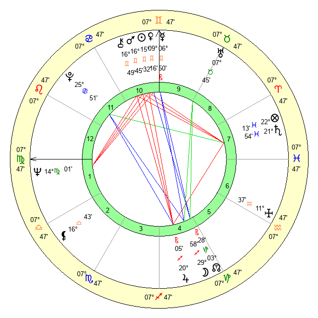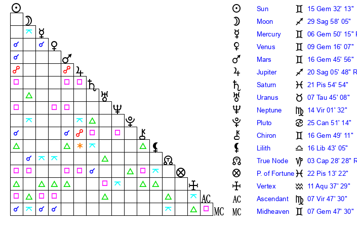 | Sun | 15 Gemini 32 | 16 Gemini 0 | 10 Virgo 44 |