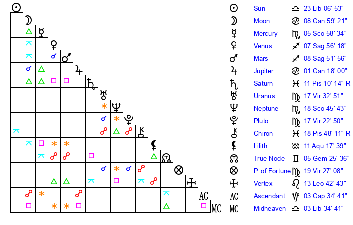 Sun | 23 Libra 7 | 23 Libra 49 | 22 Sagittarius 31 |