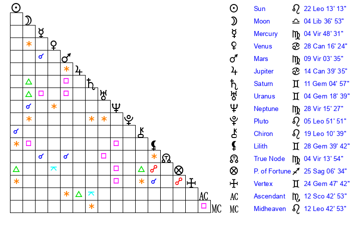 | Sun | 22 Leo 13 | 23 Leo 7 | 13 Scorpio 39 |