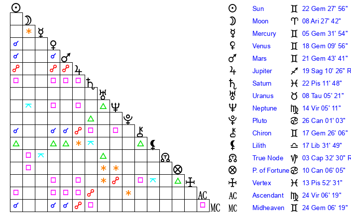 | Moon | 8 Aries 25 | 20 Capricorn 30 | 19 Cancer 33 |