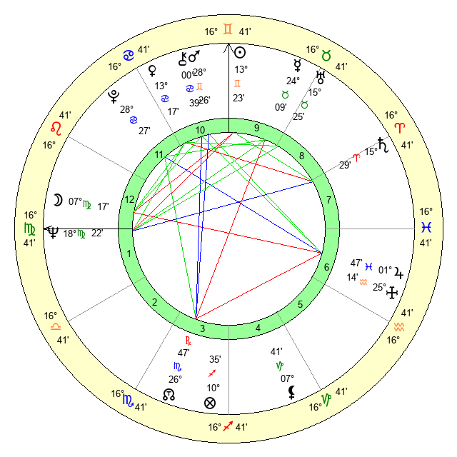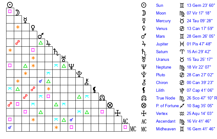 | Sun | 13 Gemini 24 | 14 Gemini 19 | 6 Virgo 38 |