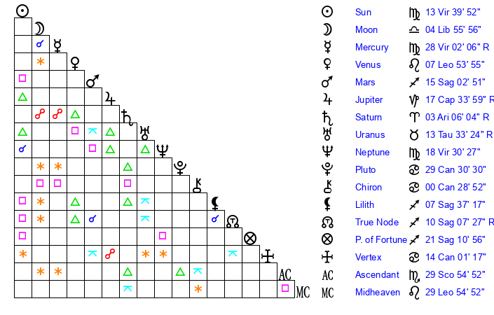 | Neptune | 18 Virgo 30 | 1 Aries 12 | 21 Virgo 2 |