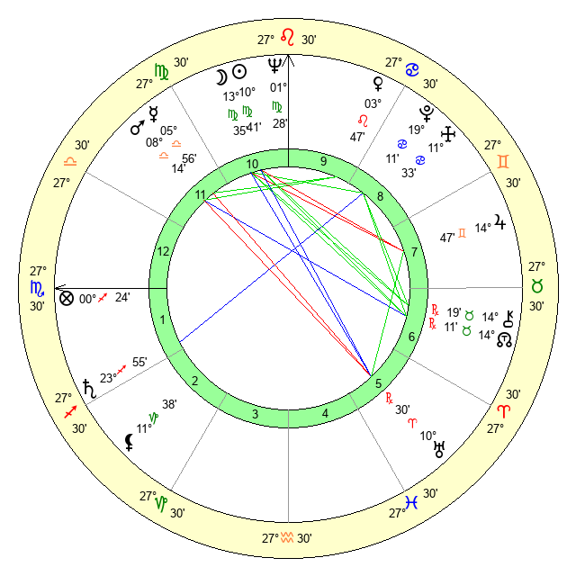 | Moon | 13 Virgo 32 | 20 Capricorn 30 | 8 Pisces 21 |