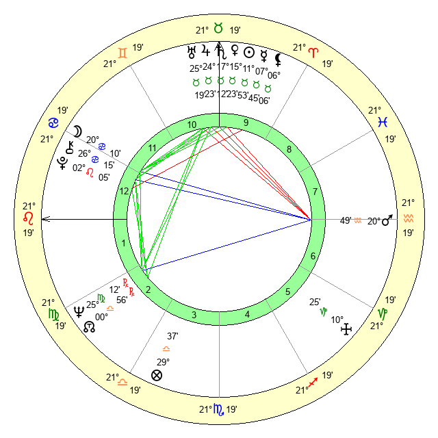 | Moon | 20 Cancer 8 | 19 Cancer 42 | 19 Leo 26 |
