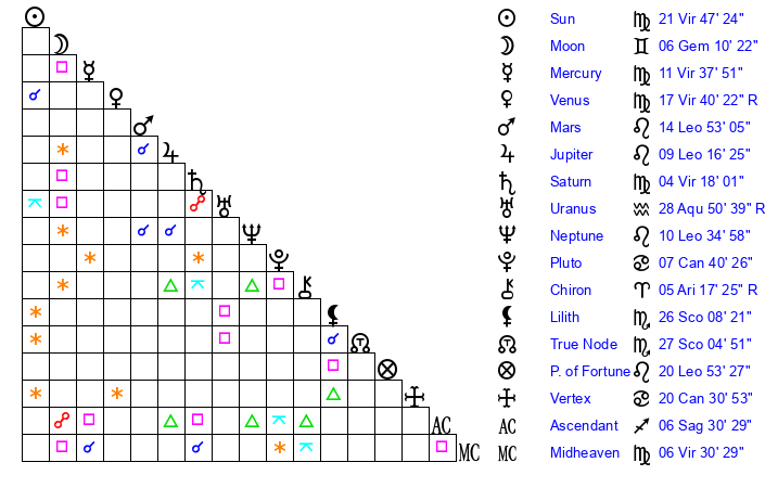 | Mercury | 11 Virgo 38 | 25 Virgo 5 | 17 Sagittarius 58 |