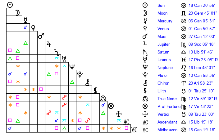 | Sun | 18 Cancer 21 | 19 Cancer 38 | 27 Libra 16 |