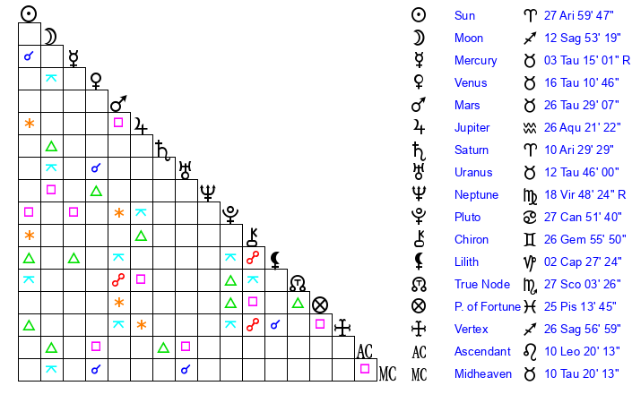 | Saturn | 10 Aries 36 | 26 Pisces 27 | 17 Aries 56 |