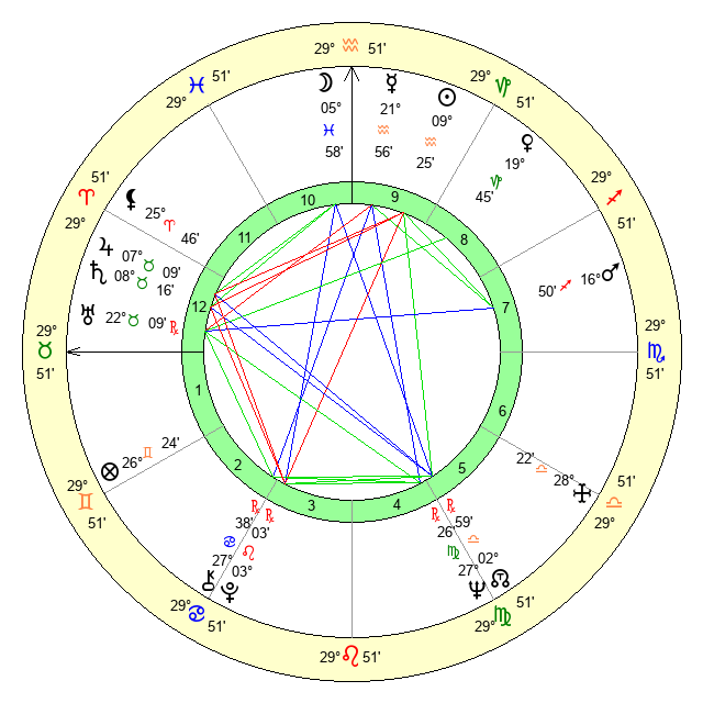 | Moon | 5 Pisces 55 | 12 Aquarius 20 | 2 Aries 4 |