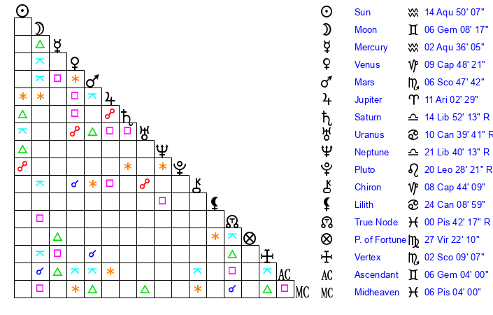 | Sun | 14 Aquarius 50 | 16 Aquarius 8 | 27 Aries 37 |