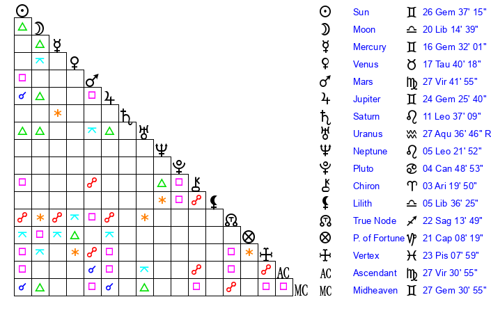 | Sun | 26 Gemini 37 | 27 Gemini 42 | 9 Libra 40 |
