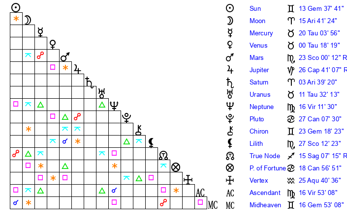 | Sun | 13 Gemini 37 | 14 Gemini 19 | 7 Virgo 51 |