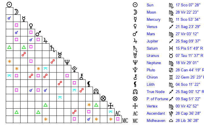 | Sun | 17 Scorpio 7 | 17 Scorpio 33 | 17 Aquarius 30 |