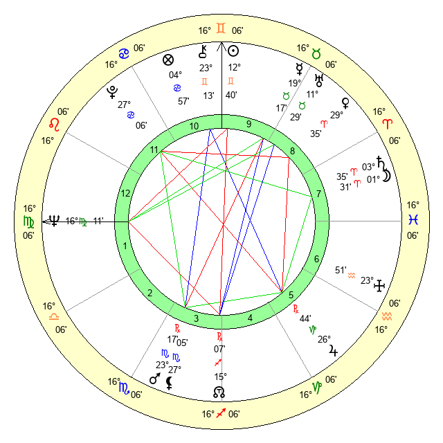 | Sun | 12 Gemini 40 | 13 Gemini 22 | 6 Virgo 53 |