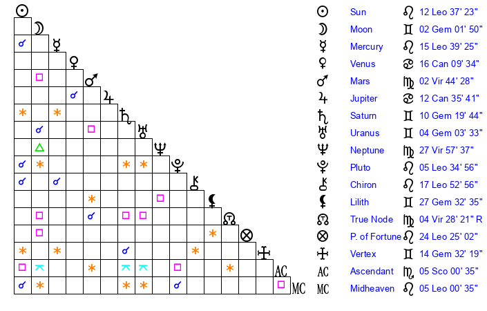 | Sun | 12 Leo 37 | 13 Leo 31 | 3 Scorpio 39 |
