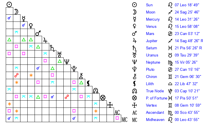 | Sun | 7 Leo 18 | 7 Leo 47 | 4 Scorpio 6 |