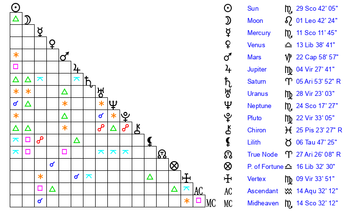 Sun | 29 Scorpio 42 | 0 Sagittarius 53 | 27 Capricorn 40 |