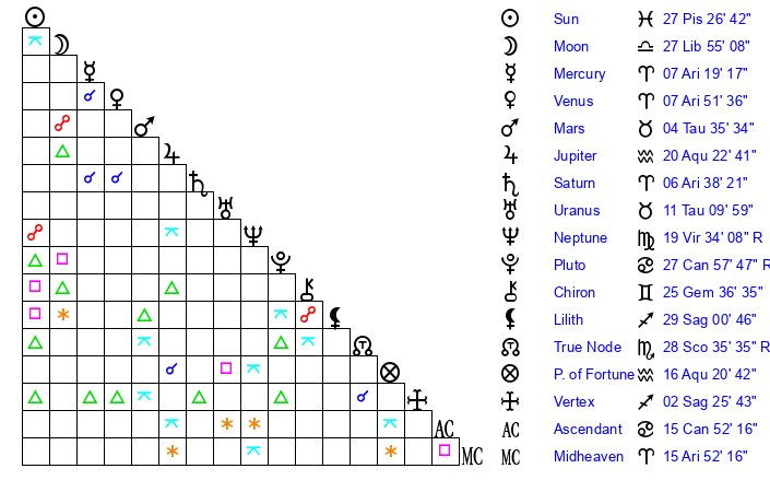 | Moon | 27 Libra 51 | 16 Scorpio 22 | 29 Sagittarius 45 |