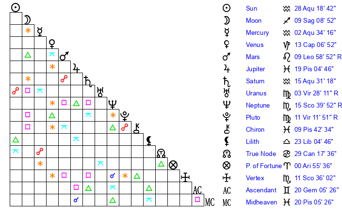 Saturn | 15 Aquarius 45 | 19 Pisces 15 | 21 Aquarius 50 |