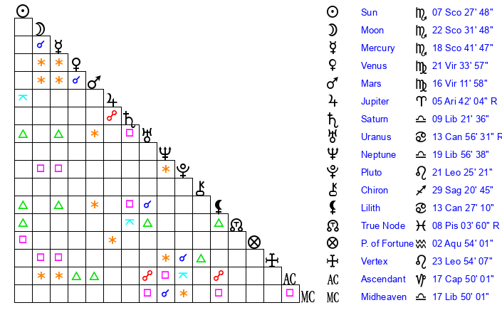 | Neptune | 19 Libra 57 | 29 Pisces 47 | 21 Libra 41 |