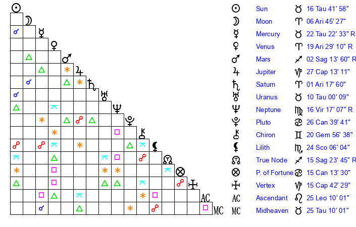 | Sun | 16 Taurus 42 | 17 Taurus 23 | 10 Leo 54 |