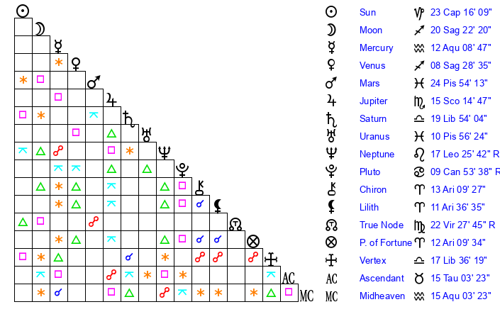 | Sun | 23 Capricorn 16 | 24 Capricorn 32 | 5 Taurus 11 |
