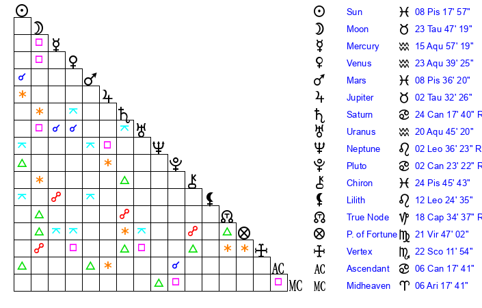 | Mars | 8 Pisces 36 | 17 Cancer 5 | 0 Gemini 25 |