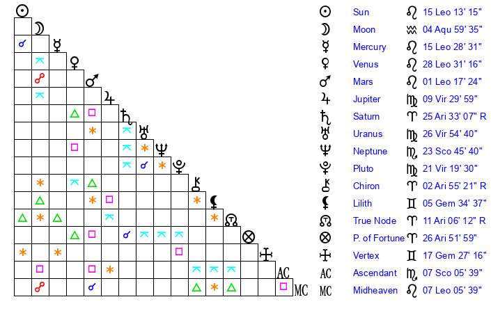 Pluto | 21 Virgo 19 | 2 Aquarius 15 | 23 Virgo 20 |