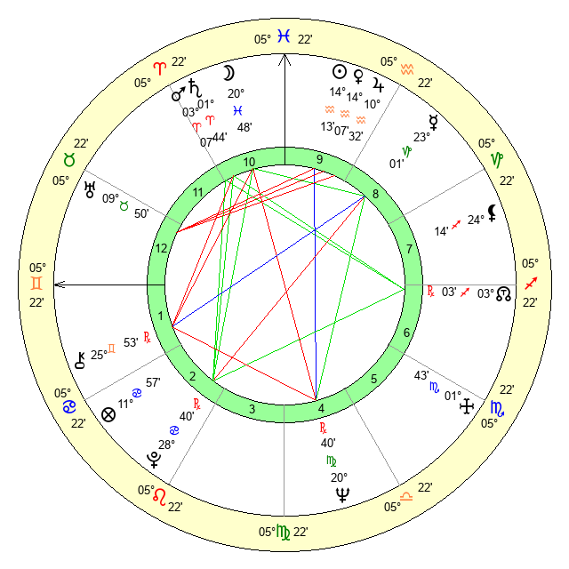 | Moon | 20 Pisces 52 | 23 Aries 41 | 0 Gemini 46 |