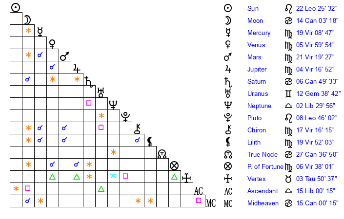 Jupiter | 4 Virgo 8 | 14 Cancer 43 | 20 Virgo 44 |
